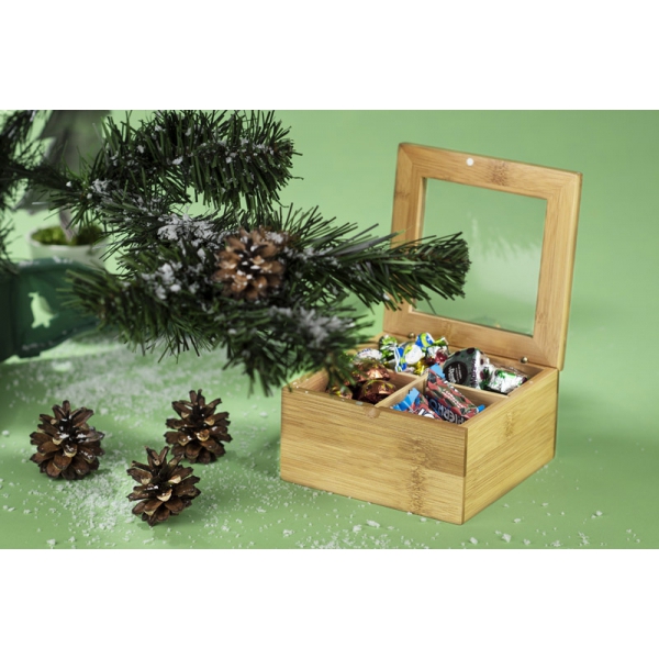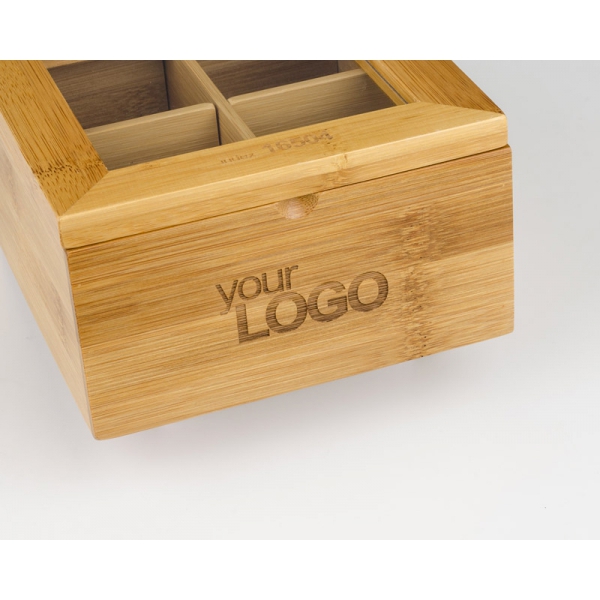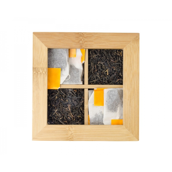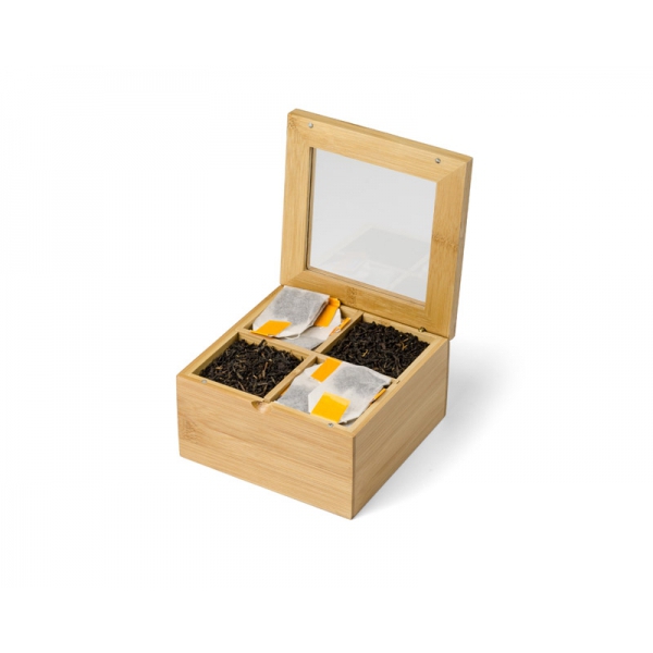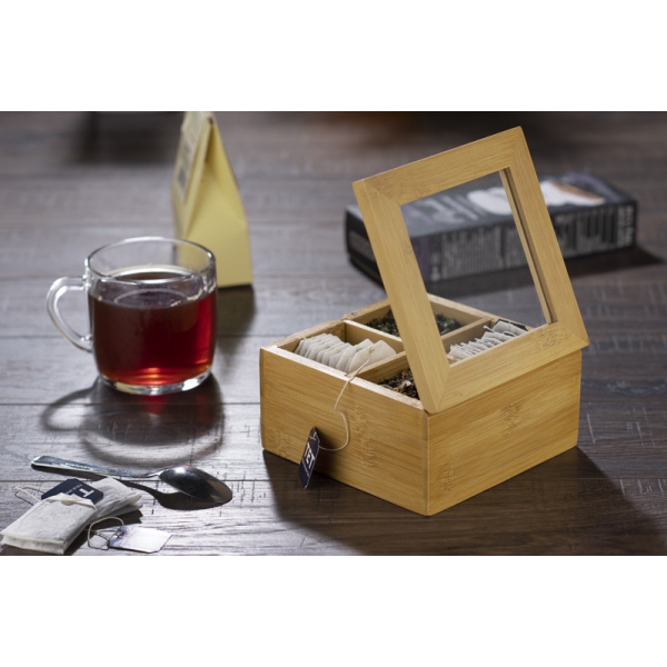 Gustowne pudełko na herbatę wykonane z bambusa. Pudełko podzielone jest na cztery części, dzięki czemu można przechowywać różne rodzaje herbaty.