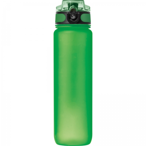 Szczelna, nie zawierająca BPA, sportowa butelka do picia wykonana z tritanu, z zamykaną pokrywką, paskiem na rękę. Pojemność 1000 ml.