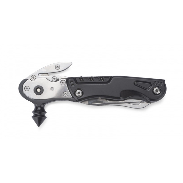 ESCAPE to niezbędne wyposażenie każdego samochodu, które warto mieć zawsze pod ręką. Zawiera aż 11 funkcji w jednym narzędziu z czego najważniejszymi są zbijak do szyb oraz przecinak do pasów bezpieczeństwa. Dodatkowo posiada takie funkcje jak: latarka, nóż, komplet 3 bitów, dwukierunkowy uchwyt na bity, uniwersalny klucz sześciokątny, płaski śrubokręt, piłę oraz otwieracz do butelek i puszek. W komplecie znajduje się również czarny, materiałowy pokrowiec na narzędzie.