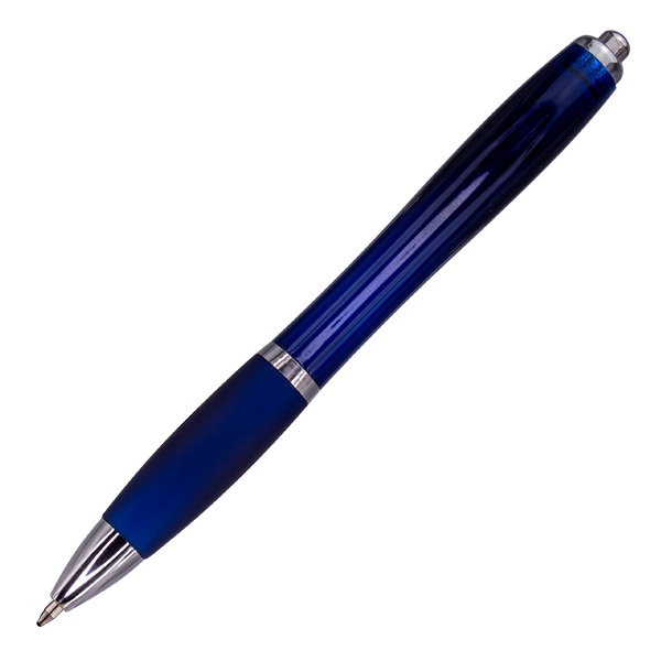 Plastikowy, transparentny długopis z dużym niebieskim wkładem, gumowaną strefą uchwytu i metalowym klipsem.