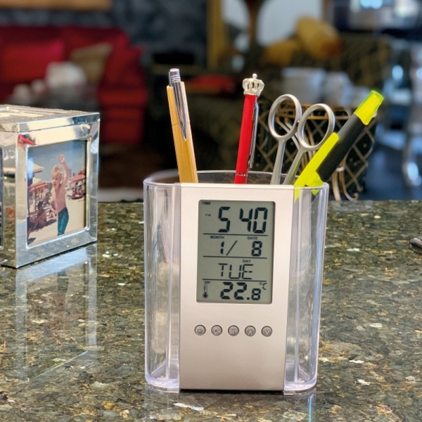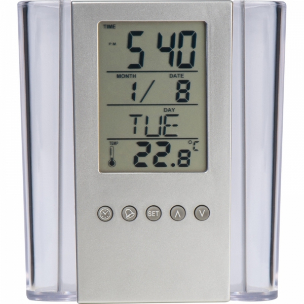 Praktyczny stojak biurkowy wykonany z akrylu, z zegarem, alarmem, termometrem i kalendarzem. Logotyp można umieścić na powierzchni pod klawiszami funkcyjnymi. Produkt zawiera baterie.