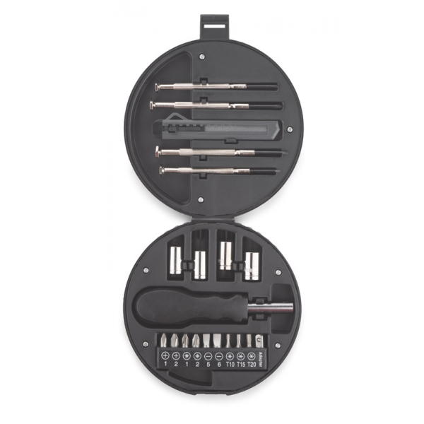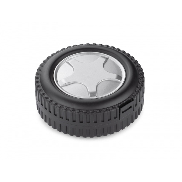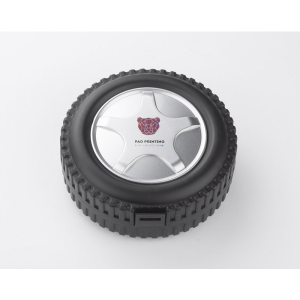WHEEL to zestaw, w którym znajduje się wiele przydatnych narzędzi: cztery śrubokręty precyzyjne, nożyk do tapet, uchwyt, cztery klucze nasadkowe z przejściówką i dziewięć bitów. Wszystko razem zamknięte jest w charakterystyczne etui w kształcie koła samochodowego.