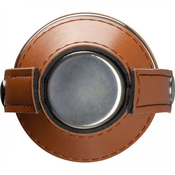 Okrągła piersiówka wykonana ze stali nierdzewnej obita skórpodobnym materiałem PU, z dwoma kieliszkami. Piersiówka ma pojemność 230 ml, kieliszki każdy po 40 ml.