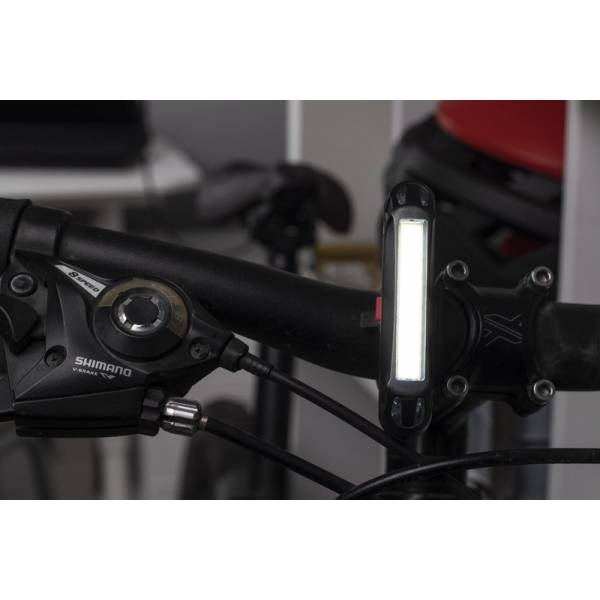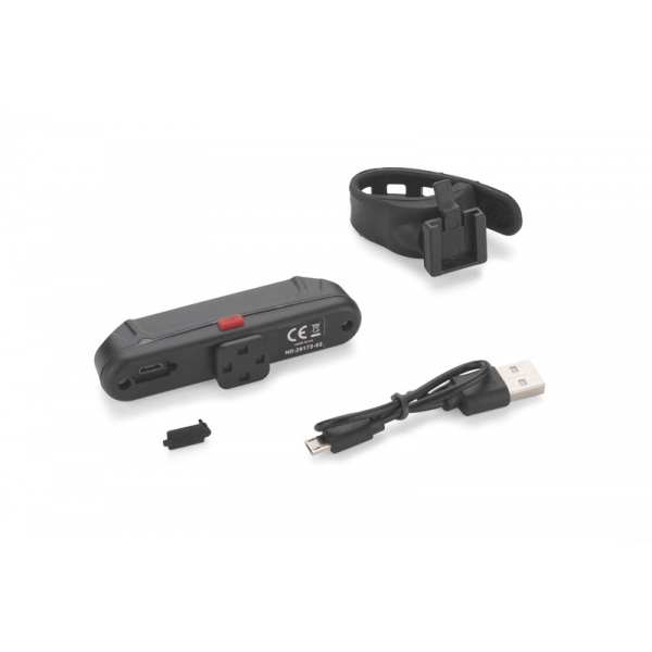Lampka rowerowa FARO to świetny gadżet dla rowerzystów. Wyposażona jest w diody LED COB i wbudowany akumulator o pojemności 500 mAh. Posiada pięć trybów działania: czerwone i białe światło stałe, dwa tryby światła czerwonego migającego oraz światło czerwone i białe migające naprzemiennie. Dzięki temu może być wykorzystana zarówno jako lampka przednia, jak i tylna. W zestawie dołączony kabel micro USB do ładowania. Posiada wygodny silikonowy uchwyt.