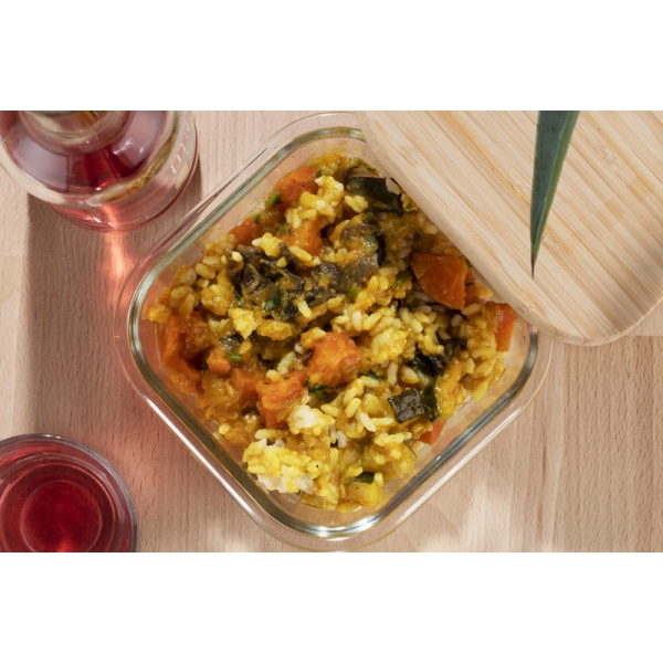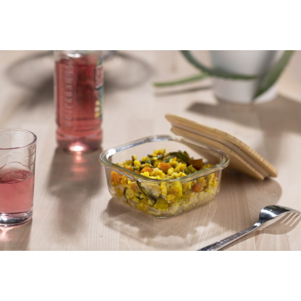 Pojemnik na żywność SOLA wykonany jest z wysokiej jakości szkła borokrzemowego. Pojemnik posiada przykrywkę z naturalnego bambusa. Można go stosować jako pojemnik lunchowy, jako pojemnik do przechowywania żywności, a ponadto można w nim podgrzewać potrawy w piekarniku lub kuchence mikrofalowej. Pojemność 350 ml.
