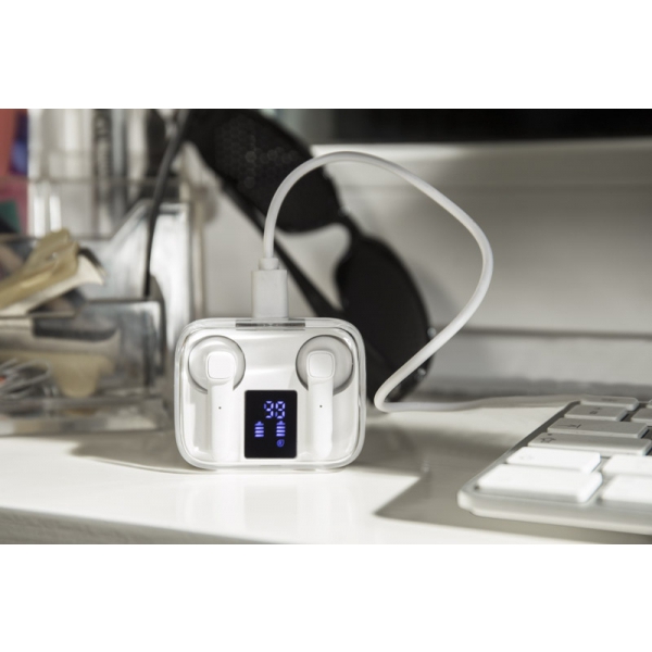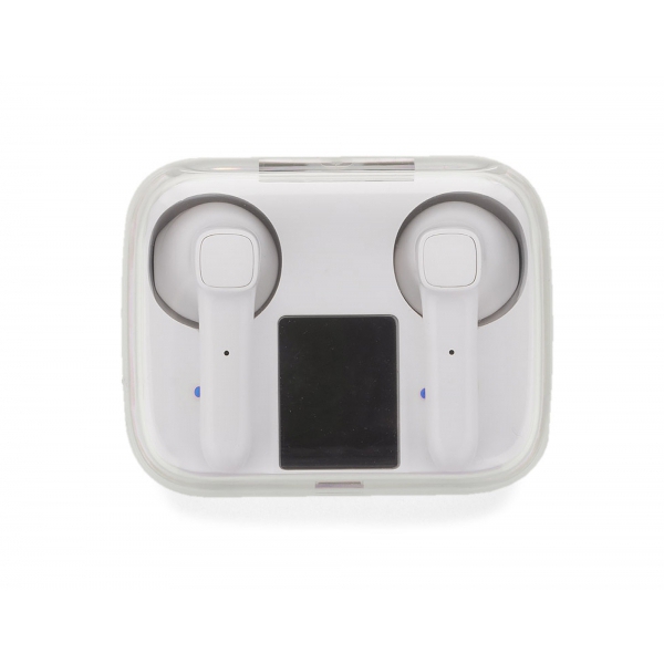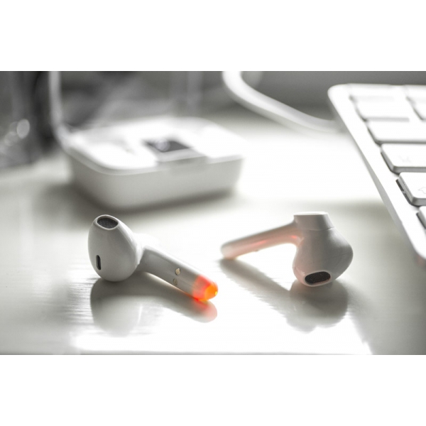 Słuchawki bezprzewodowe TRUVI to kompaktowych rozmiarów słuchawki douszne zapakowane w poręczne etui, które pełni jednocześnie funkcję akumulatora i umożliwia doładowanie urządzenia. Wyświetlacz LED pokazuje aktualny stan naładowania zarówno baterii w etui, a także każdej słuchawki. Dotykowe sterowanie słuchawek zapewnia wygodę użytkowania. Słuchawki posiadają wbudowany mikrofon, co pozwala na prowadzenie rozmów. Możliwość używania tylko jednej słuchawki. Dane techniczne: wersja Bluetooth: V5.1, częstotliwość Bluetooth: 2,4 - 2,48 GHz, zasięg Bluetooth: do 10m, pojemność baterii w każdej słuchawce: 30 mAh, pojemność baterii w etui: 300 mAh, czas pracy do 3 godz., czas czuwania: 300 godz.