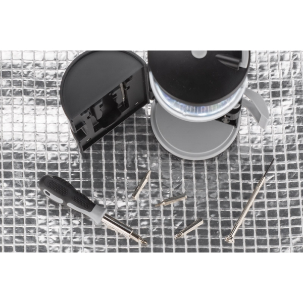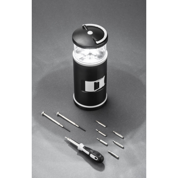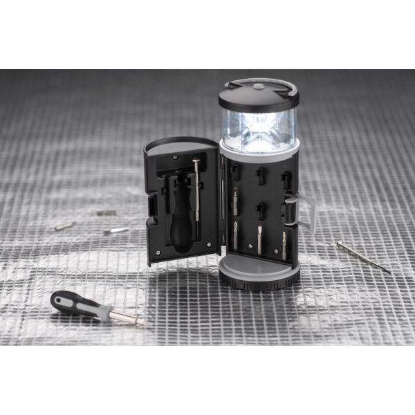 Zestaw narzędzi BARTO to zestaw w kształcie latarni zawierający śrubokręt z 8 bitami, 2 śrubokręty precyzyjne i lampka LED, pełniąca ciekawą funkcję lampki kempingowej. Posiada uchwyt do zawieszenia lub przenoszenia. Lampka jest zasilana bateriami 3xAAA. Baterie nie są dołączone.