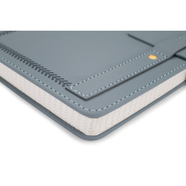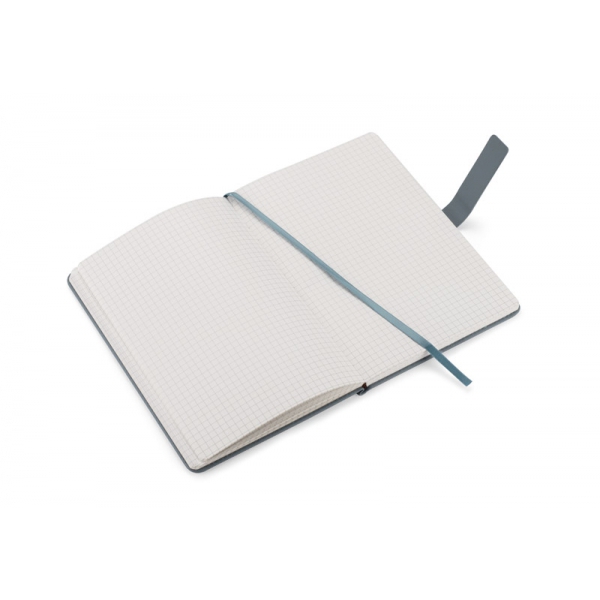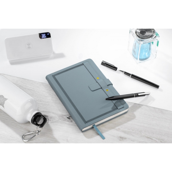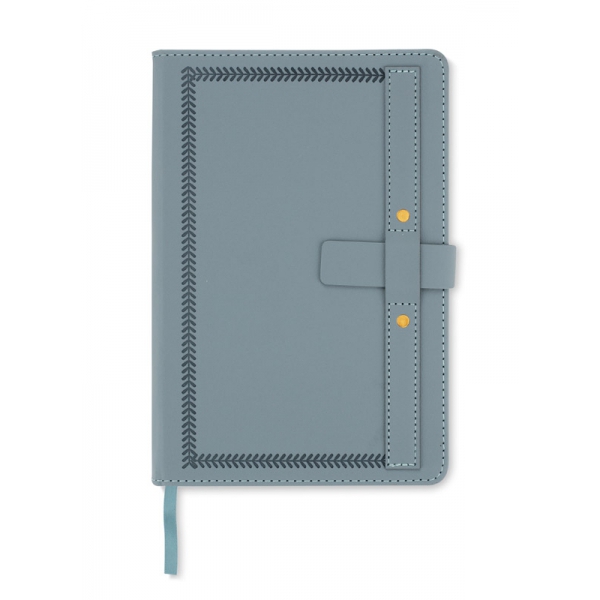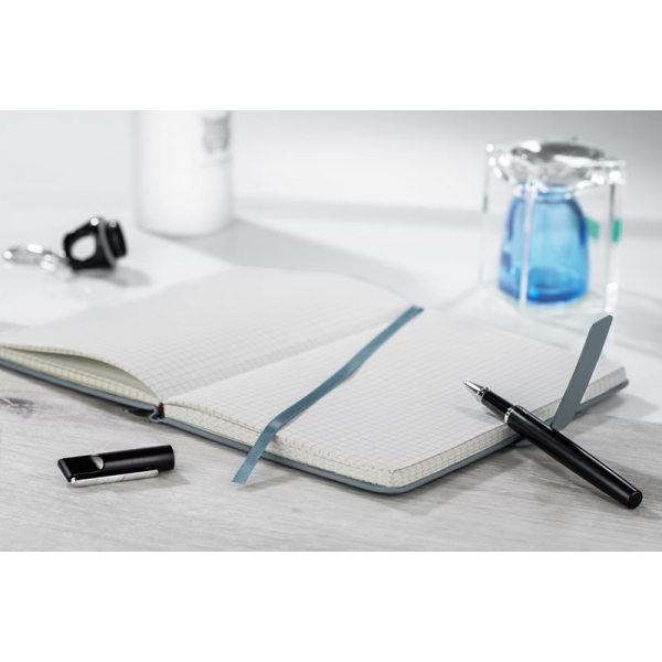Notes SCRIBO w formacie A5 to elegancki notatnik z 104 kartkami w kratkę, idealny do codziennego użytku. Twarda oprawa z materiału skóropodobnego wyróżnia się dekoracyjnym tłoczeniem, przeszyciem oraz charakterystycznym paskiem z ozdobnymi nitami. Notes zamykany jest na wsuwany pasek, który zabezpiecza zawartość przed przypadkowym otwarciem. Dodatkowo wyposażony jest w tasiemkę do zaznaczania stron. Świetnie sprawdzi się jako gadżet reklamowy z możliwością znakowania.