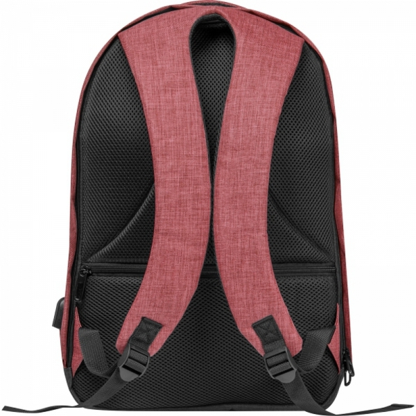 Plecak wykonany z poliestru 600D z wyjściem na kabel USB, przegrodą na laptopa, wyściełanymi, oddychającymi szelkami i przednią przegrodą antykradzieżową.