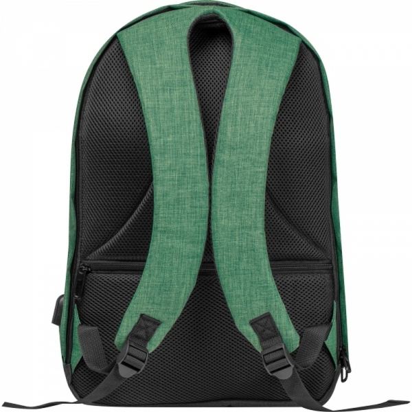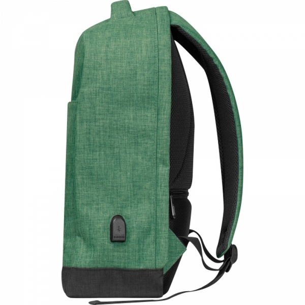 Plecak wykonany z poliestru 600D z wyjściem na kabel USB, przegrodą na laptopa, wyściełanymi, oddychającymi szelkami i przednią przegrodą antykradzieżową.