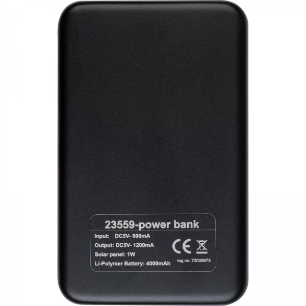 Power bank o pojemności 4000mAh, wykonany z metalu. Posiada funkcję Two Way Power (ładowanie solarne lub przez kabel USB). Dane techniczne:Input: DC5V-800mAOutput: DC5V-1200mASolar panel: 1WPojemność: 4000mAhŁadowanie: micro USB podłączyć do komputera za pomocą USB AInne:Dołączony kabelek ze złączami USB A i mikro USB