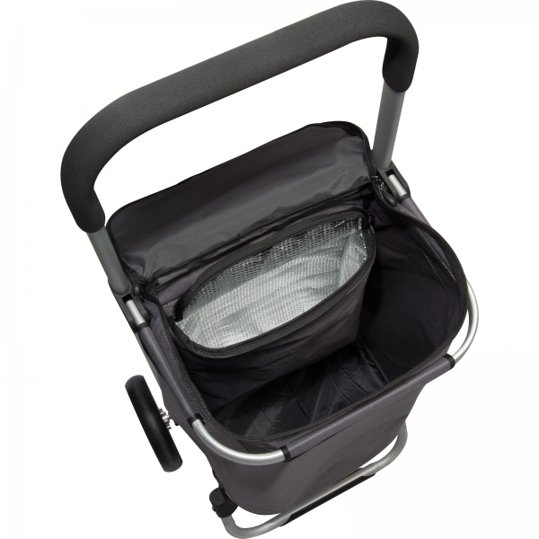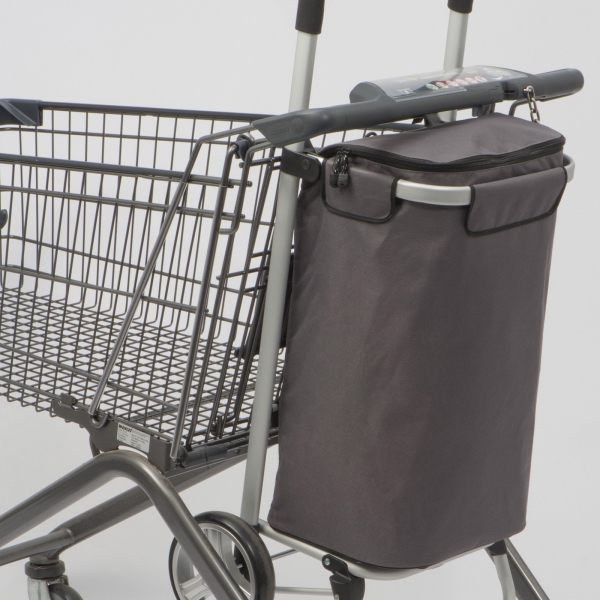 Składany wózek na zakupy uszyty z poliestru, z kieszenią termiczną. Rama wykonana z aluminium, posiada specjalny haczyk, dzięki któremu można go zawiesić na wózku sklepowym.