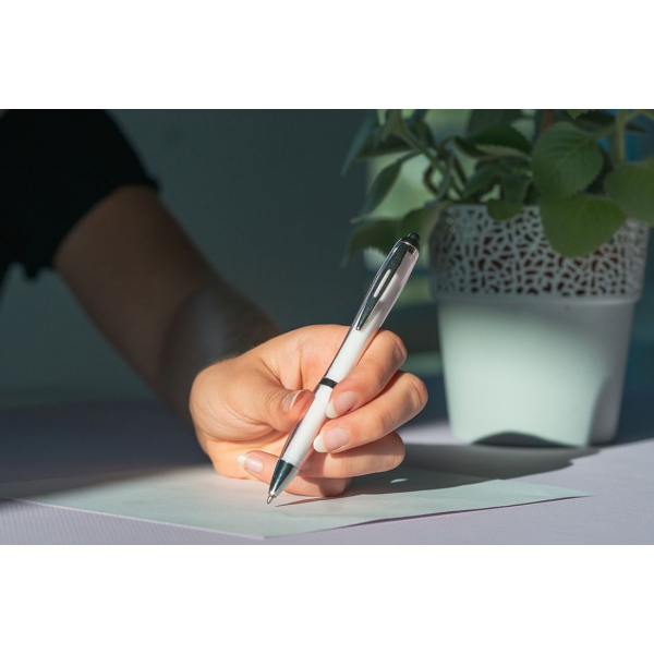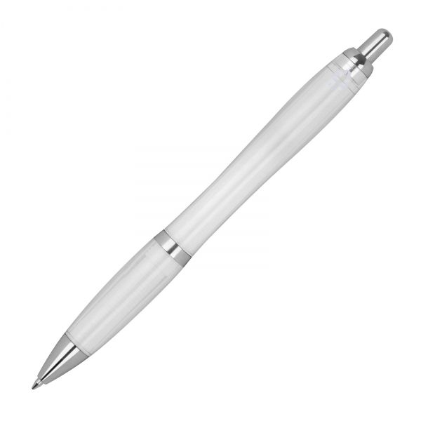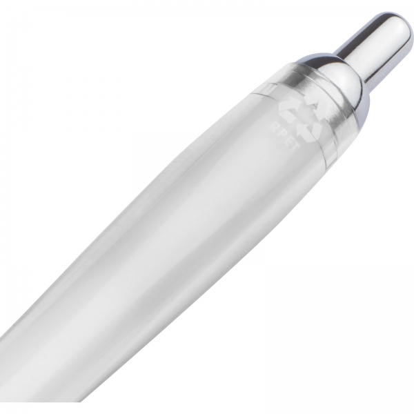 Długopis wykonany z plastiku pozyskiwanego z recyklingu (przetworzony PET), przezroczysty, ze srebrnymi akcentami i gumową strefą chwytu.