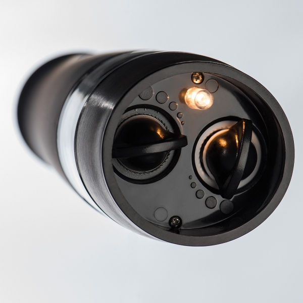 Elektryczny młynek do soli i pieprzu ze stali nierdzewnej i akrylu, o gumowanej powierzchni. Posiada dwie oddzielne komory, które mogą być niezależnie obsługiwane za pomocą przycisków.