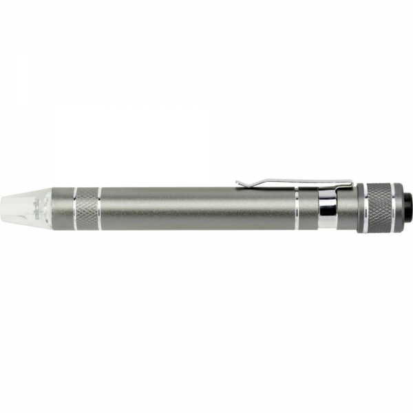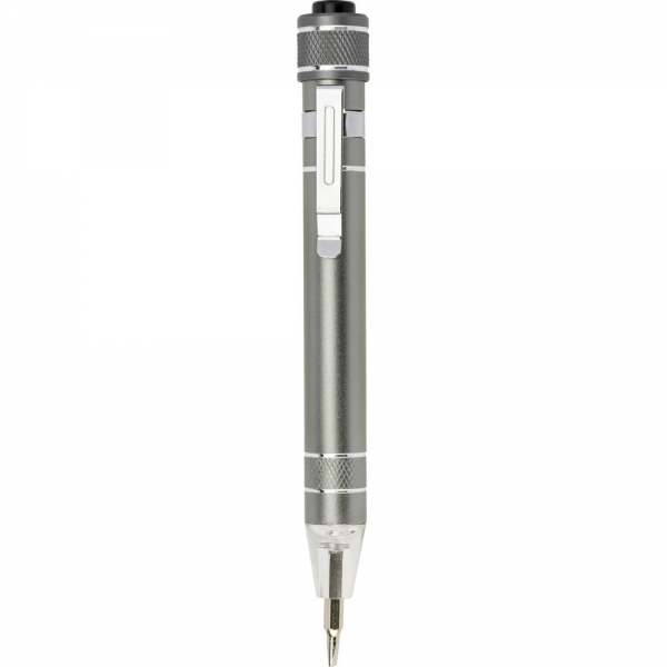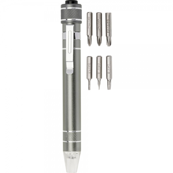Śrubokręt w kształcie długopisu z lampką LED i końcówkami: 3 płaskie i 3 krzyżakowe