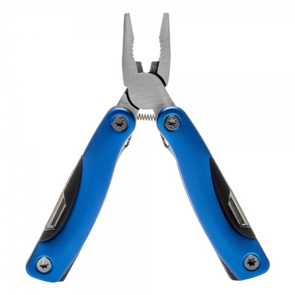 Narzędzie wielofunkcyjne w czarnym pokrowcu, posiada 12 funkcji oraz kolorowy uchwyt z czarnymi elementami, produkt wykonany z aluminium i stali nierdzewnej