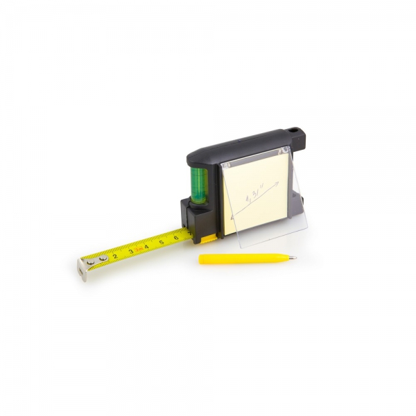 Miara 2 m z klipem umożliwiającym przyczepienie np. do paska, posiada wbudowaną poziomicę, notatnik z przezroczystą klapką zabezpieczającą przed zabrudzeniami będącą jednocześnie miejscem pod znakowanie oraz długopis z wkładem w niebieskim kolorze, produkt wykonany z między innymi z ABS