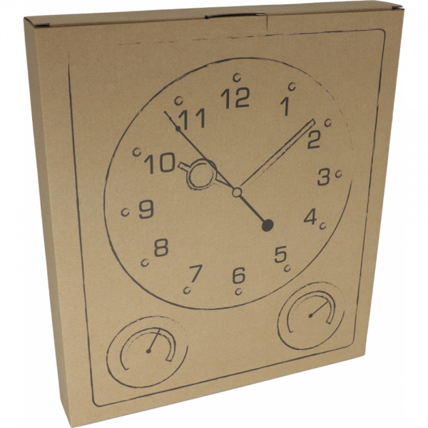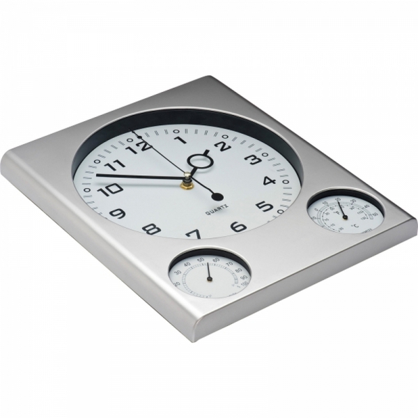 Zegar ścienny z higrometrem i termometrem, wykonany z plastiku i akrylu. Produkt nie zawiera baterii.
