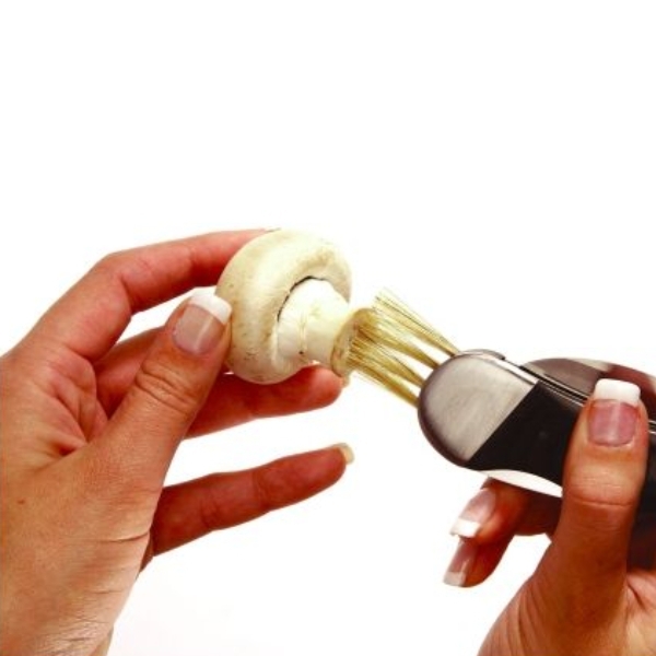 Nóż do zbierania grzybów, wykonany ze stali nierdzewnej i drewna, wyposażony w pędzelek do czyszczenia grzybów.