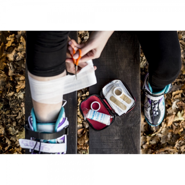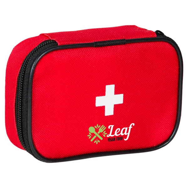 Apteczka w pokrowcu z główną przegrodą na zamek błyskawiczny, z tyłu posiada mocowanie na rzep umożliwiające przyczepienie np. do paska, zawiera 8 elementów stanowiących wyposażenie apteczki: 10 plastrów, 4 płatki nasączone alkoholem, 2 taśmy, 2 nieprzylegające opatrunki, 2 bandaże, 2 waciki, 2 chusteczki nasączone mydłem oraz nożyczki, produkt wykonany z poliestru 600D