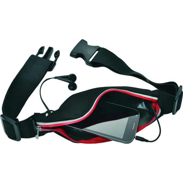 Elastyczny, odporny na wilgoć pasek, z rozciągliwą kieszonką z wodoodpornym zamkiem. Zawiera odblaskowe elementy oraz wyjście na słuchawki.