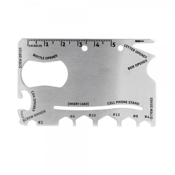 Narzędzie wielofunkcyjne w etui, posiada 9 funkcji: linijka (5 cm / 2 cale), mini wkrętak, otwieracz do kartonu, 2x wkrętak, klucze płaskie (#2, #4, #6, #8, #10, #12), podstawka pod telefon (karta nie jest dołączona), otwieracz do puszek, otwieracz do butelek, produkt wykonany ze stali nierdzewnej