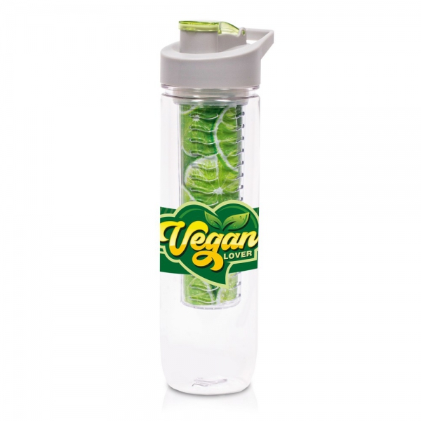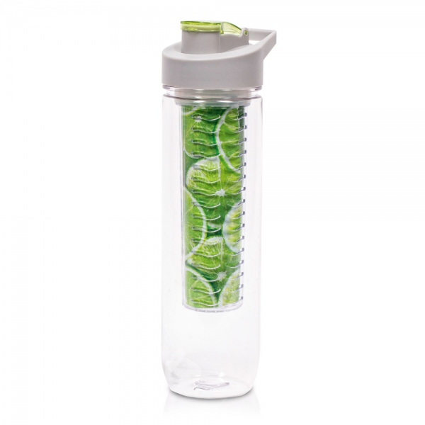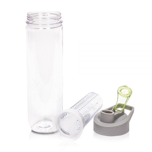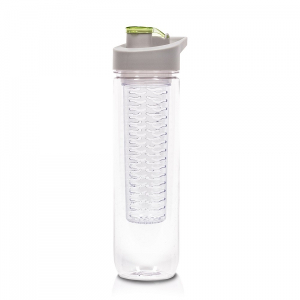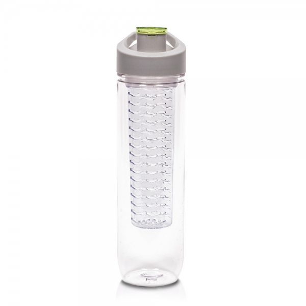 Butelka sportowa 800 ml Air Gifts, posiada pojemnik na lód lub owoce umożliwiający nadanie wodzie smaku według własnych preferencji, szara zakrętka z uchwytem ułatwiającym noszenie i kolorowym zamknięciem, butelka przeznaczona wyłącznie do zimnych i niegazowanych napojów, produkt wykonany z Tritanu i PP