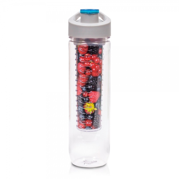Butelka sportowa 800 ml Air Gifts, posiada pojemnik na lód lub owoce umożliwiający nadanie wodzie smaku według własnych preferencji, szara zakrętka z uchwytem ułatwiającym noszenie i kolorowym zamknięciem, butelka przeznaczona wyłącznie do zimnych i niegazowanych napojów, produkt wykonany z Tritanu i PP